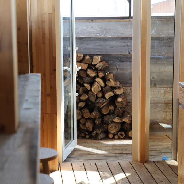 内観は木目そのままで優しい空間。その中で薪を焚いて暖をとるも良し。パチパチ燃える音を聴くのもオススメです。